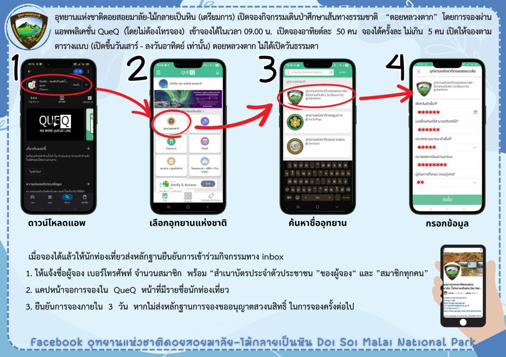 ชื่ออุทยานฯ จะปรากฏใน QueQ ในวันที่เปิดจอง หากค้นหาในวันที่ไม่ได้เปิดจองจะยังไม่พบชื่ออุทยานแห่งชาติดอยสอยมาลัย-ไม้กลายเป็นหิน(เตรียมการ)